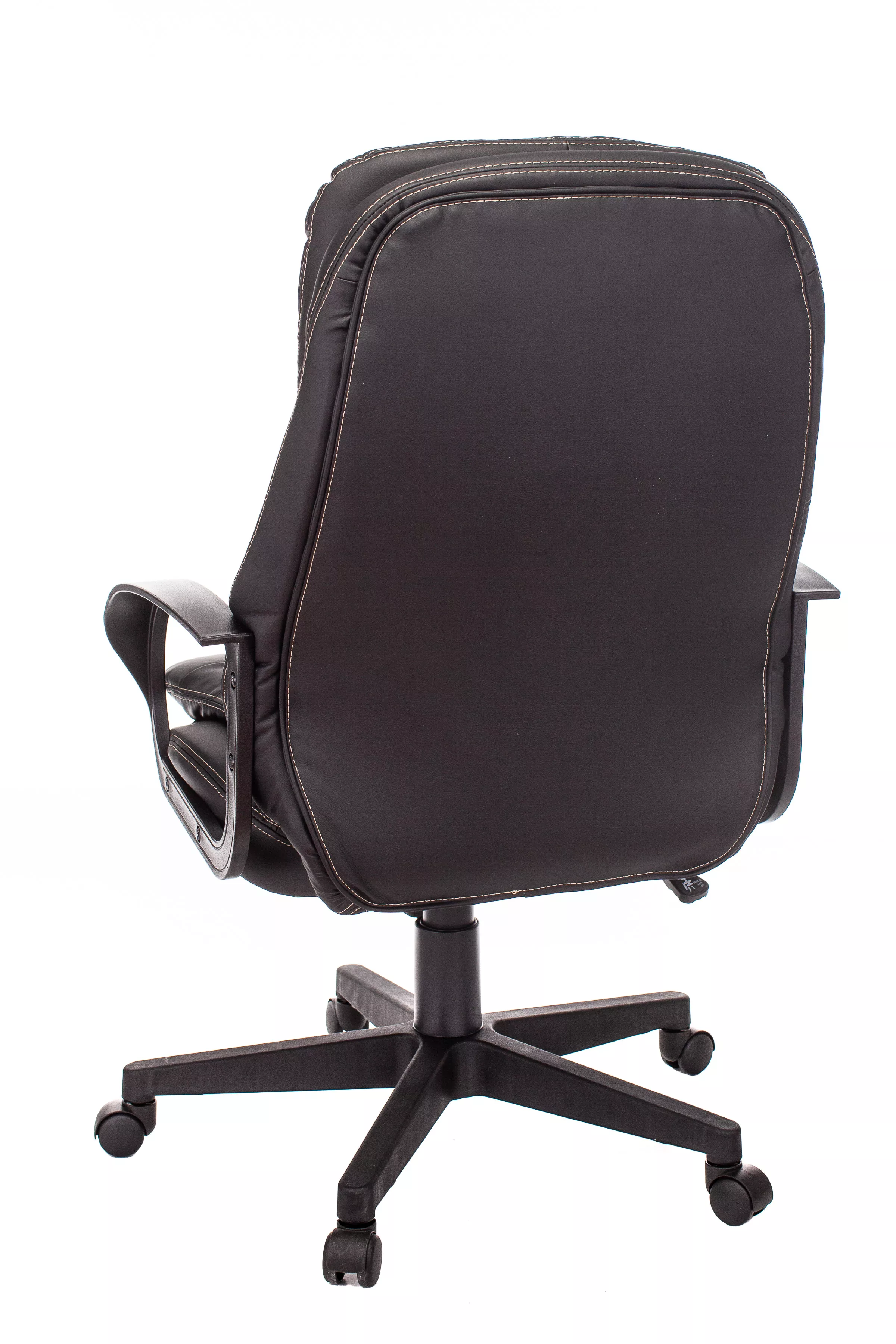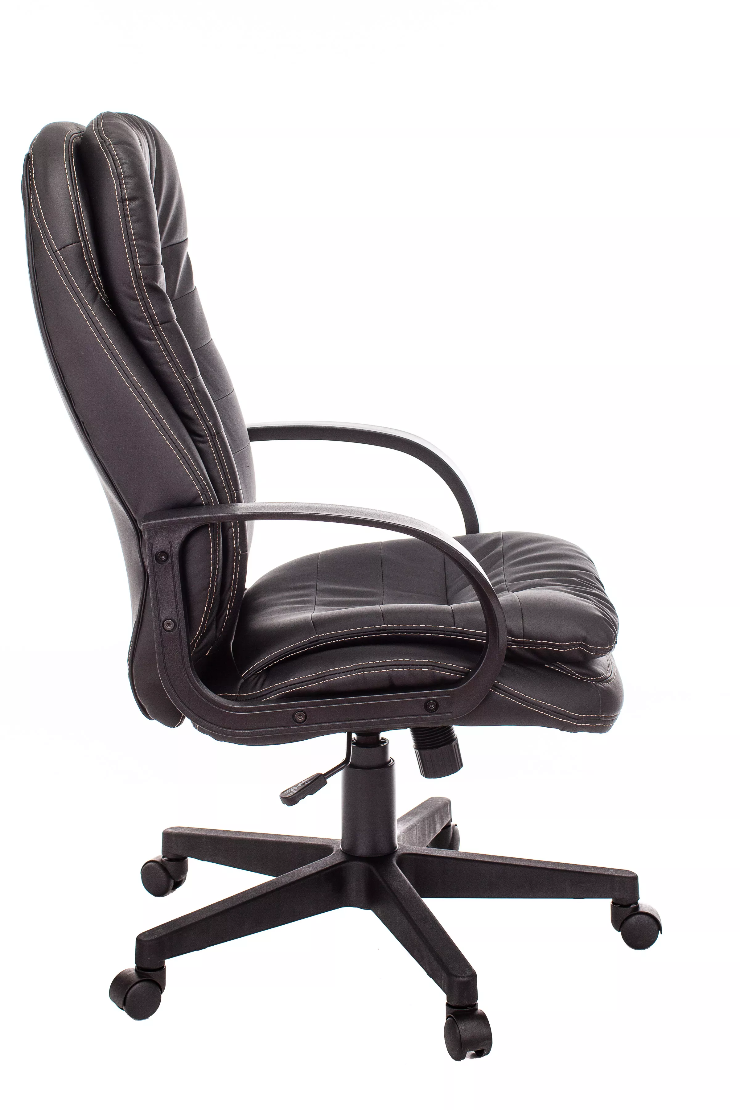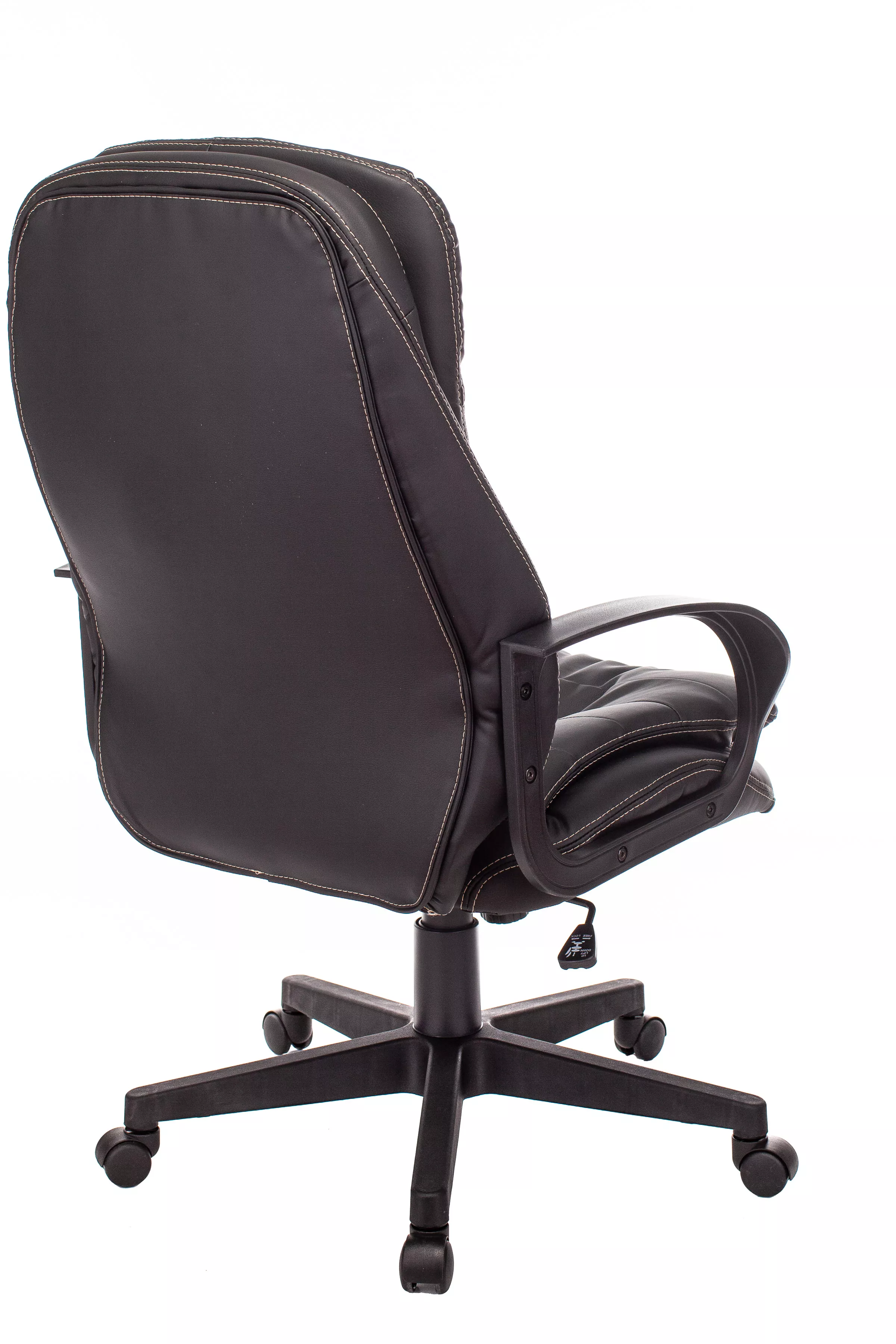 Обивка кресла выполнена из высококачественной экокожи черного цвета, которая не только стильно смотрится, но и легко чистится. Спинка кресла отделена от сиденья, что позволяет обеспечить лучшую вентиляцию и комфорт при длительном сидении. Высота кресла варьируется от 1065 мм до 765 мм с подлокотниками, а высота сиденья составляет 495 мм. Ширина сиденья — 565 мм, а глубина — 460 мм, что обеспечивает достаточное пространство для комфортного размещения.